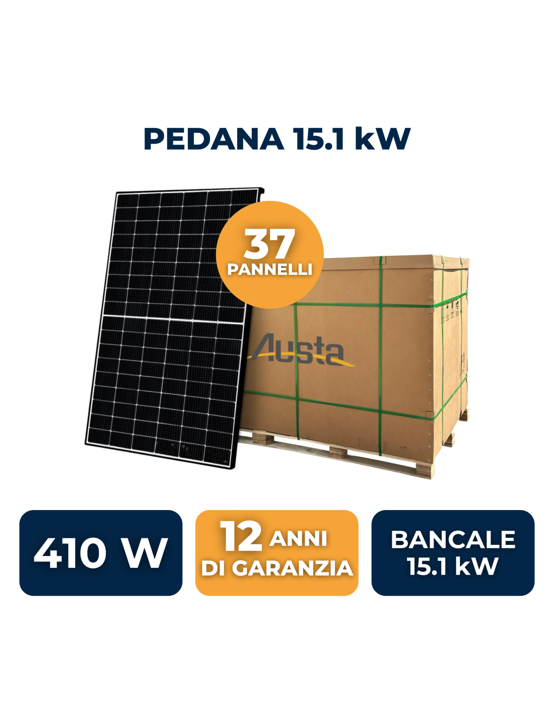 Il Kit “bancale completo 15,1 kW” con 37 pannelli solari Austa 410 W — formato 1762 × 1134 × 30 mm con frame nero (black frame) — rappresenta una soluzione plug-and-play per chi desidera realizzare un impianto fotovoltaico di taglia medio-grande, con alta efficienza e ottimizzazione spazio/produzione.