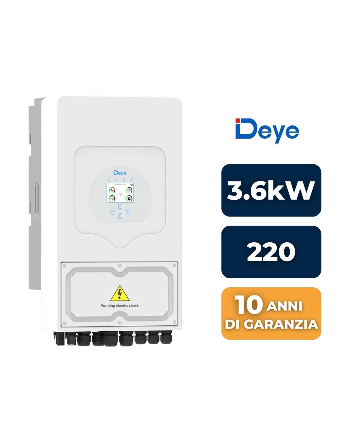 L’inverter fotovoltaico DEYE SUN-3.6K-SG03LP1-EU – 3,6 kW monofase è progettato per assicurare prestazioni elevate, massima efficienza di conversione e una gestione intelligente dell’impianto fotovoltaico. Grazie alla tecnologia DEYE, una delle più affidabili nel settore degli inverter di stringa, il SUN-3.6K-SG03LP1-EU garantisce un’ottima produzione energetica anche in condizioni di irraggiamento variabile.