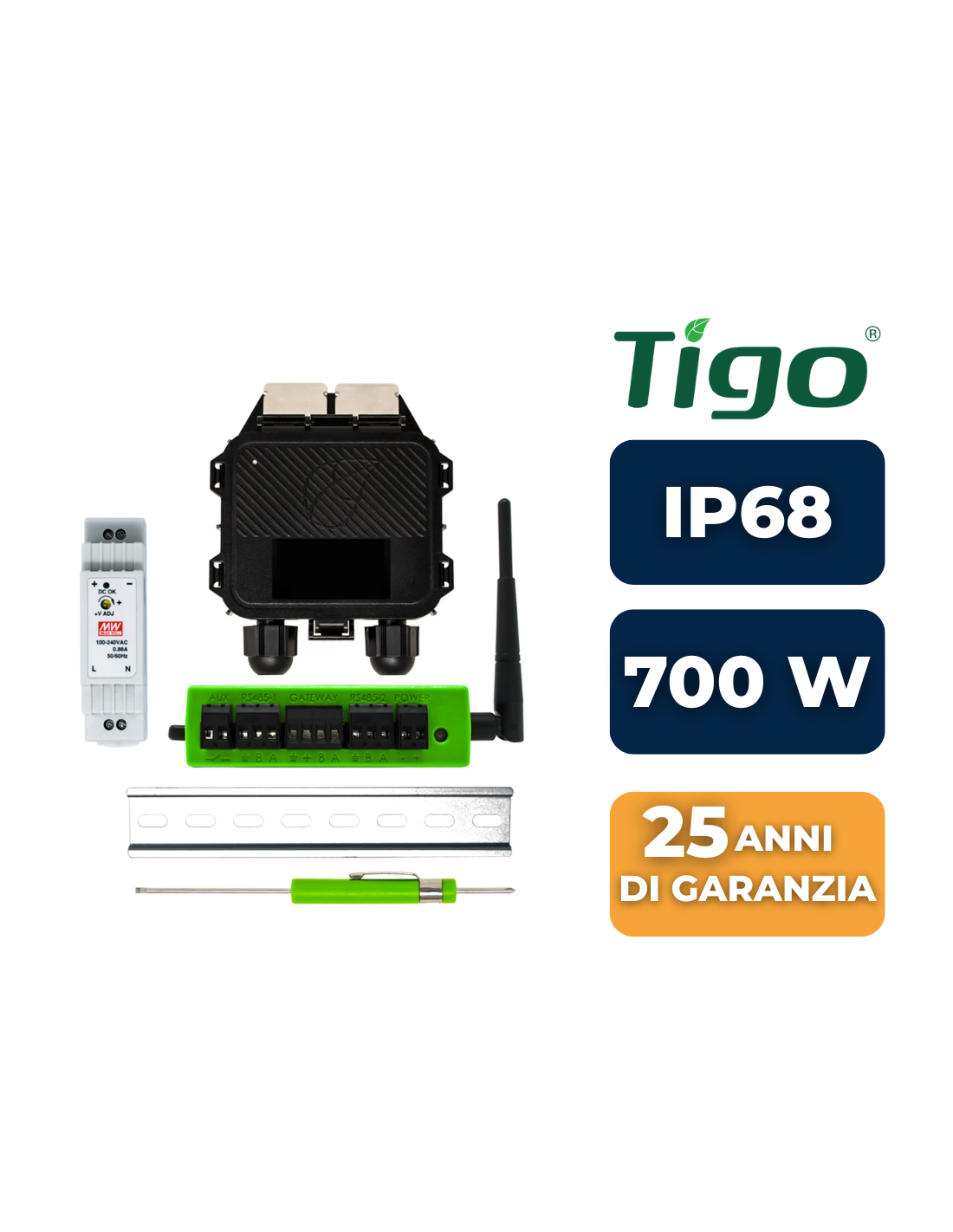 Il TG-KITCCA è il kit di controllo e monitoraggio avanzato di Tigo Energy, pensato per impianti fotovoltaici dotati di ottimizzatori/moduli intelligenti Tigo TS4. Il kit comprende: